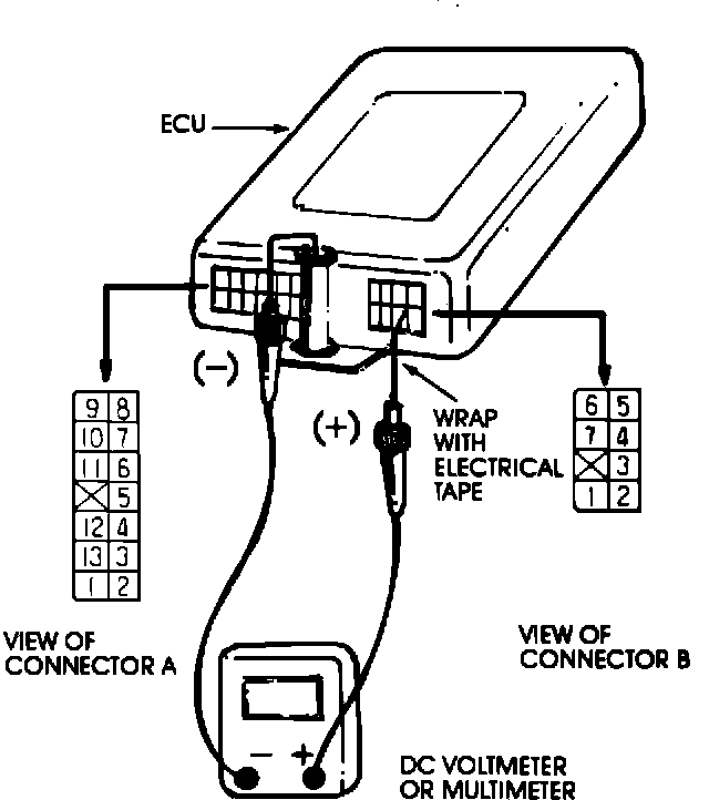 CAUTION: Short-circuiting the positive (+) probe between a connector terminal and ground could damage the vehicle wiring, the sensor, the ECU, or all three. Use care to avoid it! Insulate the exposed part of the probe with electrical tape as a precaution.