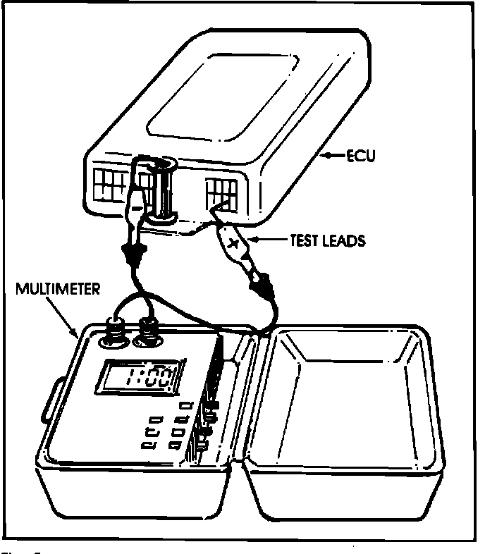 To perform the FBC system tests, you will measure voltages right at the computer which is on the right cowl kick panel. Make up a set of thin probes (paper clips work fine) to attach to your voltmeter and insert into the tops of the connectors on the computer as shown in Figure 1. You don't have to unplug the connectors.