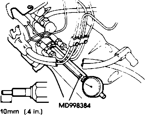 6. Set up the Prestroke Measuring Adapter (M 998384). *Be sure the push rod is adjusted to 10 mm (0.4 in.) then thread the adapter and dial indicator into the rear of the pump to a point where it lightly contacts the pump.