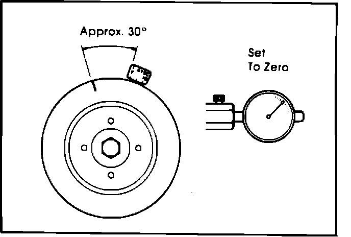 8. Push the truck backward until the crankshaft pulley timing mark has moved counterclockwise to a position approximately 30~ BEFORE TDC. Turn the face of the dial indicator to zero.