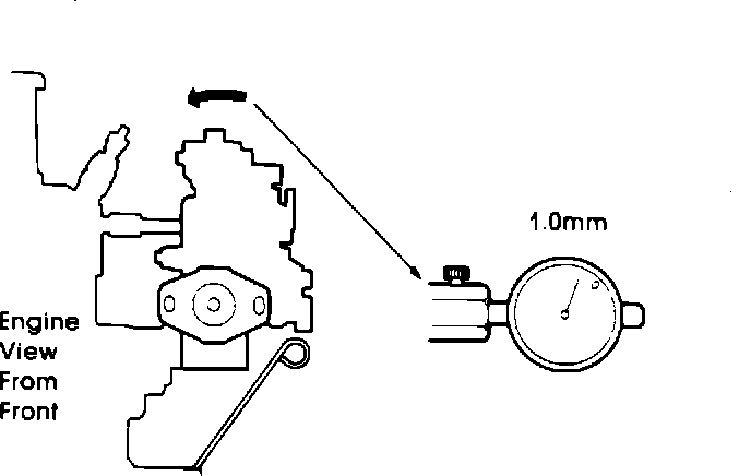 10. Push the injection pump toward the engine until the dial indicator reads 1.0 mm, then tighten the two nuts and two bolts securing the pump.