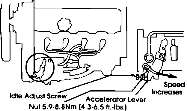 3. Using a tachometer, read idle speed. If not 750 rpm +/- 50, adjust to specification using the idle speed adjusting screw. NOTE: