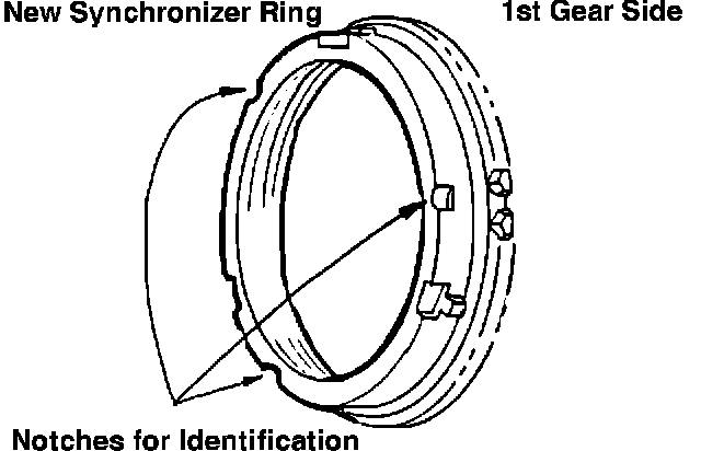 (1) Synchronizer ring: The new ring is thinner by 0.3 mm, the 1st gear chamfer angle is changed, and three identification notches are added on the 1st gear side. See Figs. 2, 3, and 4.