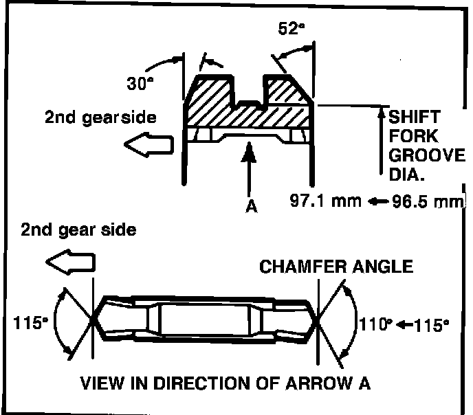 Angles have been changed, the shift fork groove diameter has been increased, and the chamfer angle on the 1st gear side has been changed to match the synchronizer ring. See Fig. 6.