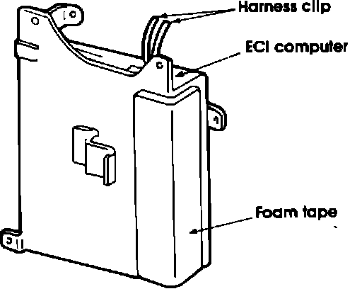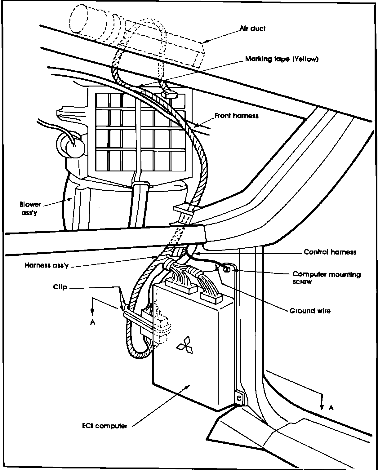 NOTE: Clip the harness to the front harness at the point marked by yellow tape, and route the harness over the air duct to support it as in Fig. 10. Connect the ground wire to the computer mounting screw.