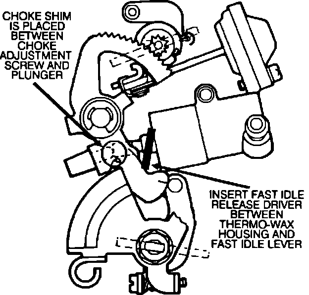 9A. Using the fast idle release driver special tool, insert the tool between the thermo wax element housing and the choke linkage (Figure 9).