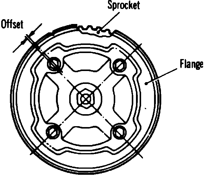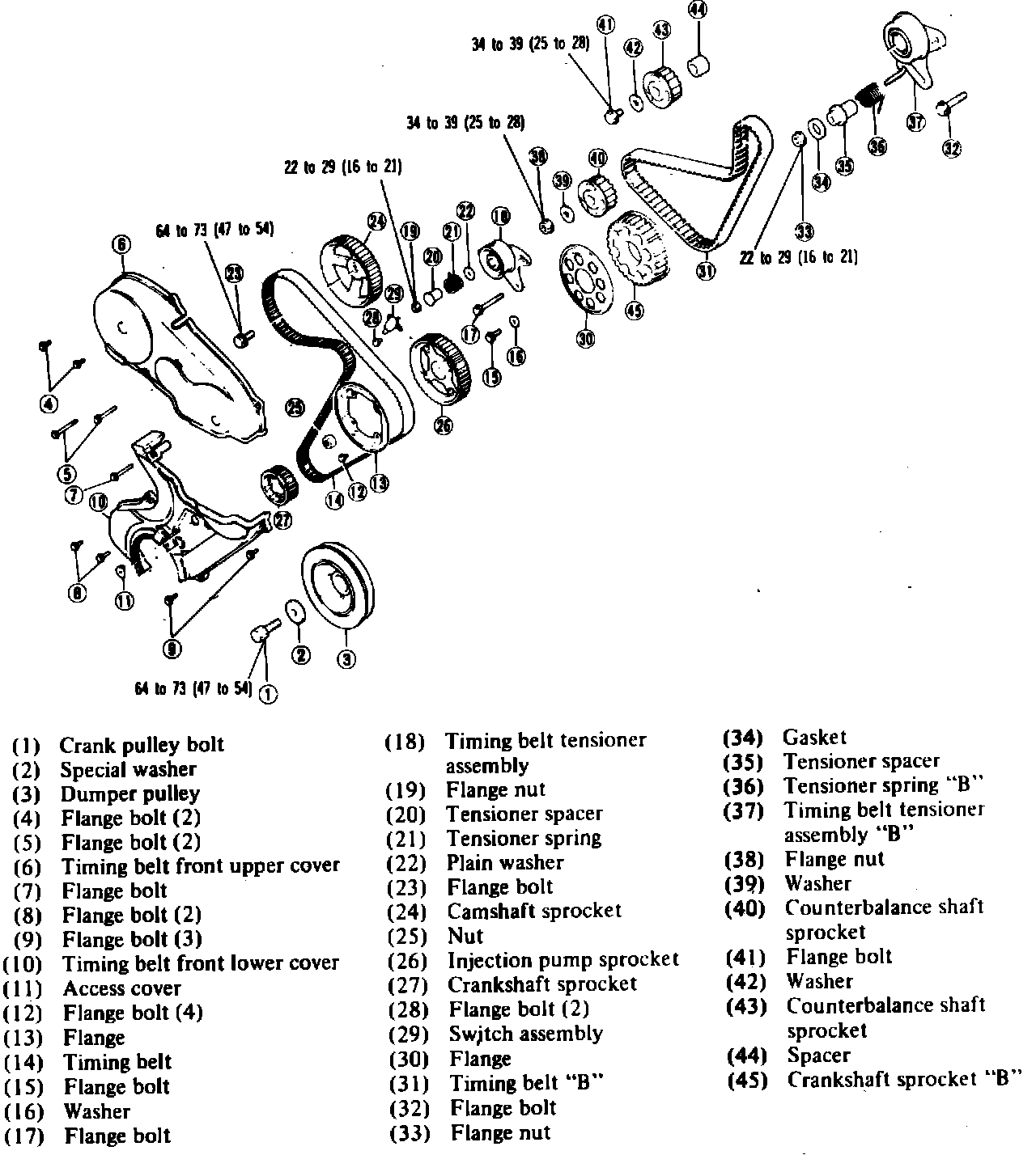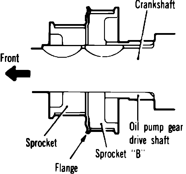 5. Reverse procedure to install. Install crankshaft sprocket B, flange and sprocket as shown in Fig. 4. Install injection pump sprocket and install flange to injection pump sprocket, Fig. 5. Install spacer on left silent shaft with chamfered end toward oil seal. Tighten silent shaft sprockets nut and bolt with shafts held in position as shown in Fig. 3.
