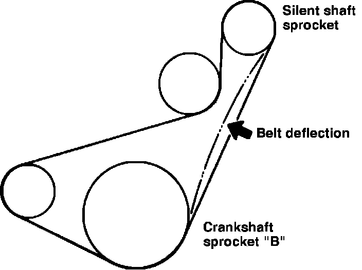 7. Align timing marks of silent shaft sprockets and crankshaft sprocket. Install timing belt B with no slack on tension side. Push down on B belt with finger at point A as in Fig. 6.
