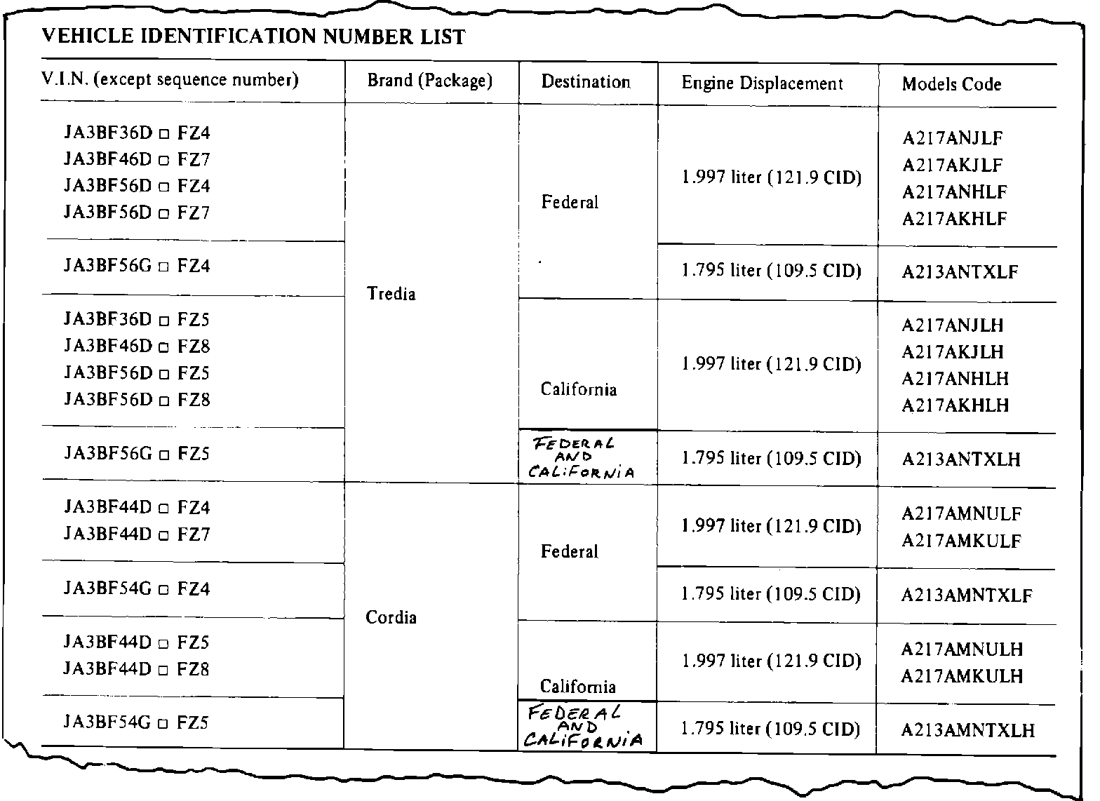 1985 CORDIA/TREDIA SERVICE MANUAL, PAGE 4 Revise the Vehicle Identification Number List to show "Federal and California" for the California turbo model . . . as shown below.