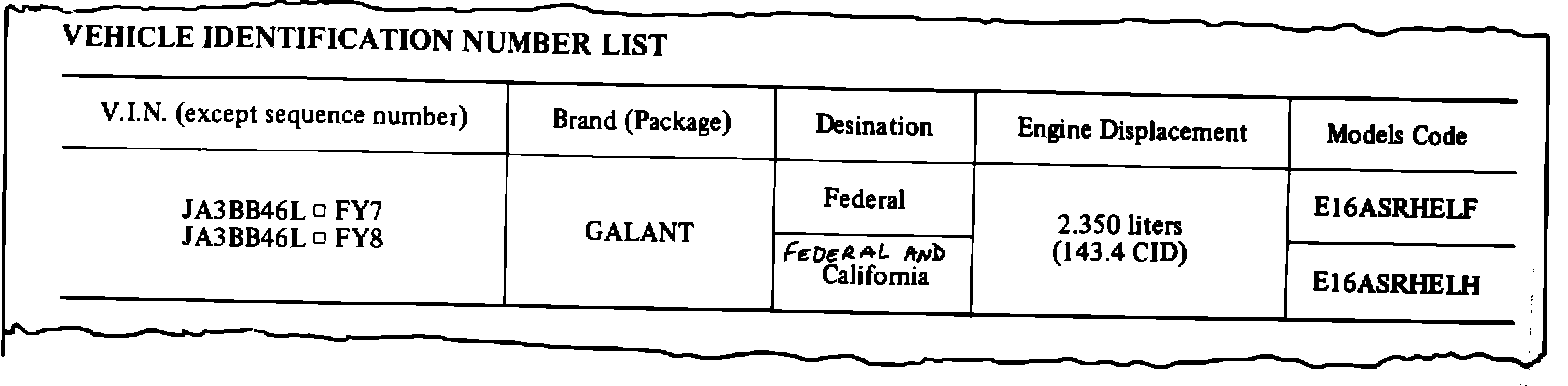 1985 GALANT SERVICE MANUAL, PAGE 3 In the Vehicle Identification Number List, add the words "Federal and" above "California" as shown below.
