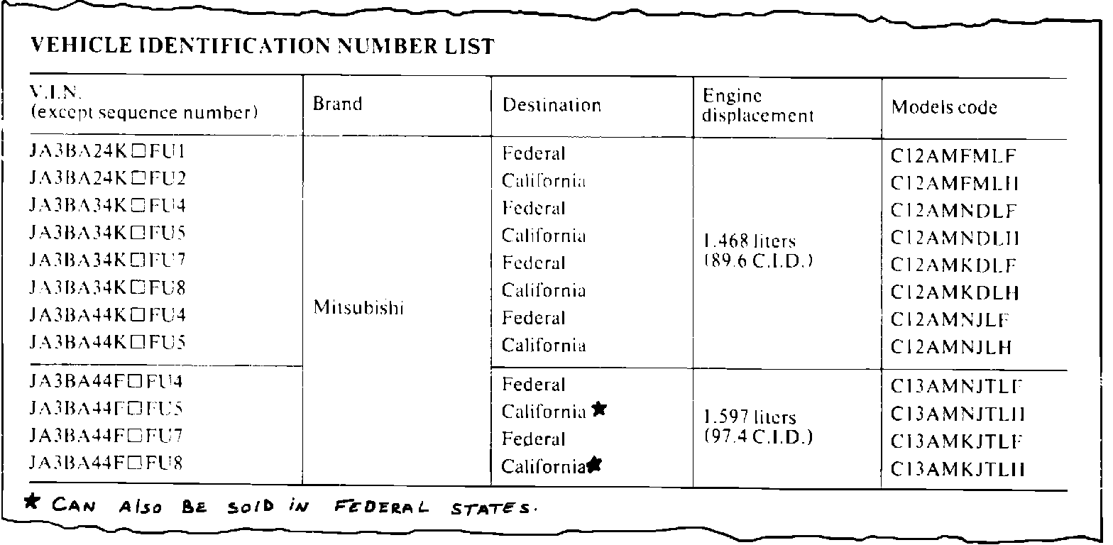 1985 MIRAGE SERVICE MANUAL, PAGE 4 Add asterisk (*) and a footnote to show that the California Mirage turbo is certified as a 50-state vehicle.