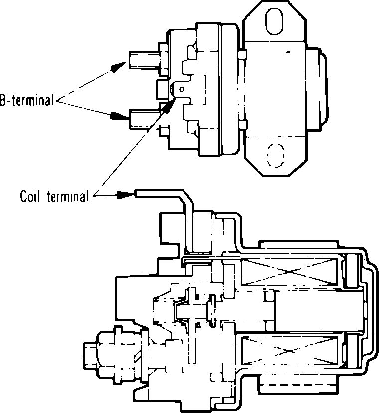 Connect 6 volt power source to relay coil terminal and check for continuity between relay B terminals, Fig. 36. Continuity should exist, if not, replace relay.