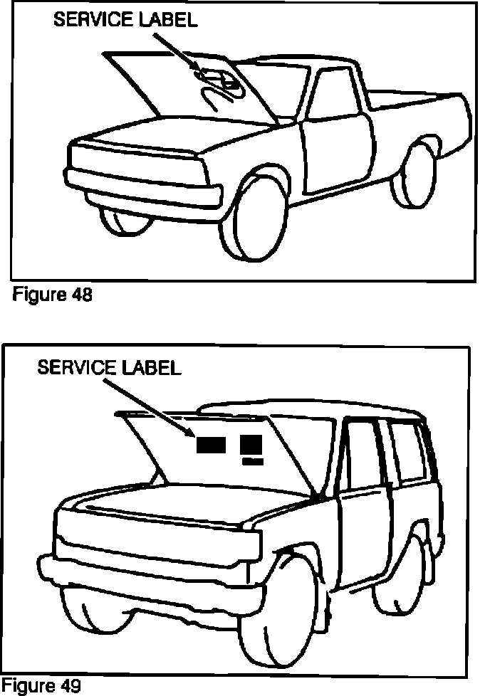 Install the new service label contained in the EMR-90-008 emission kit over the old label on the underside of the hood (Truck-Figure 48, Montero-Figure 49).