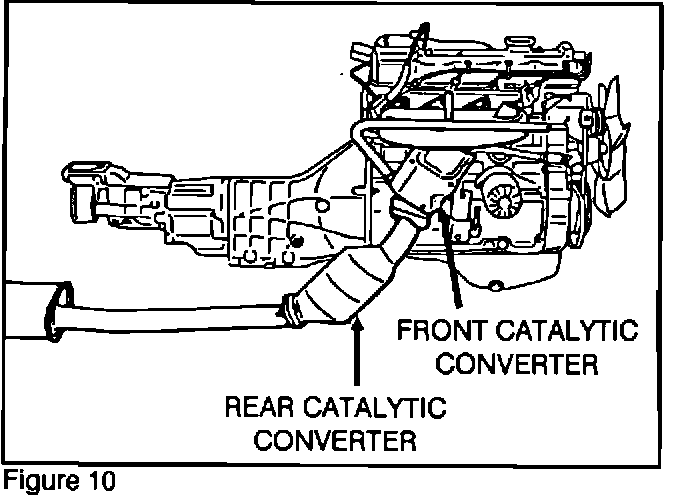 1. Liberally spray penetrating oil on the front catalytic converter retaining bolts. Replace the front catalytic converter (Figure 10) with the unit contained in the EMR-92-009 emission kit.