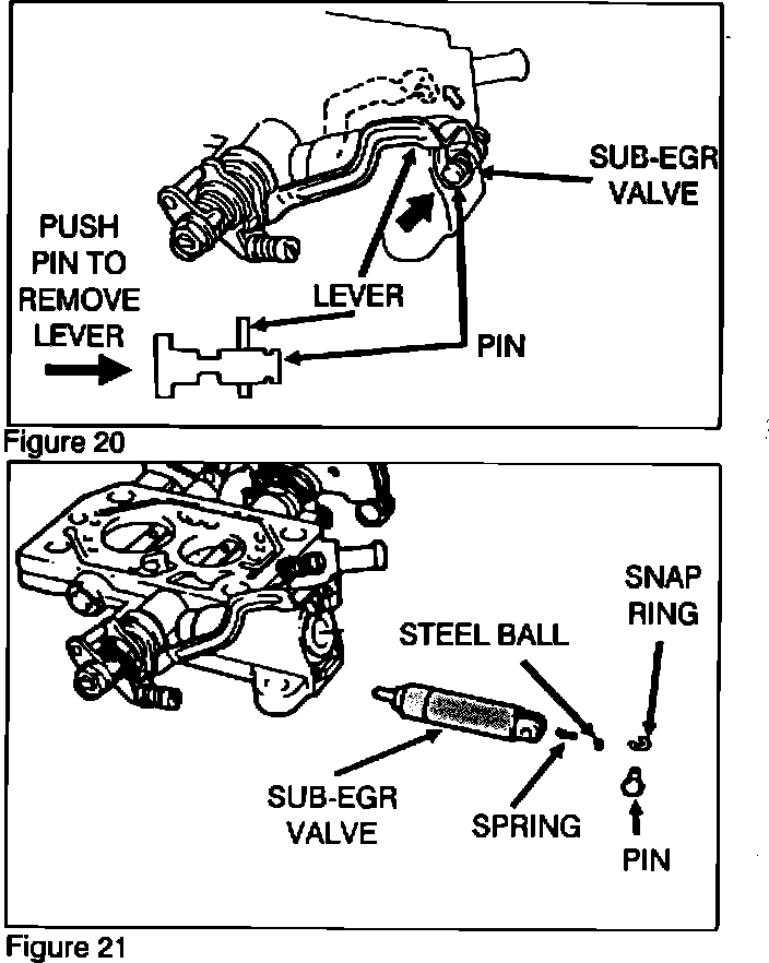 If the Sub-EGR valve will not come out of the carburetor, remove the snap ring from the Sub-EGR valve pin (Figure 21). Then carefully remove the pin and the link, taking care not to lose the spring and steel ball from the valve. Insert a small phillips screwdriver in the pin hole for use as a handle. Loosen the carbon deposits by spraying carburetor cleaner into the Sub-EGR Valve passages. Then, remove the valve from the carburetor.
