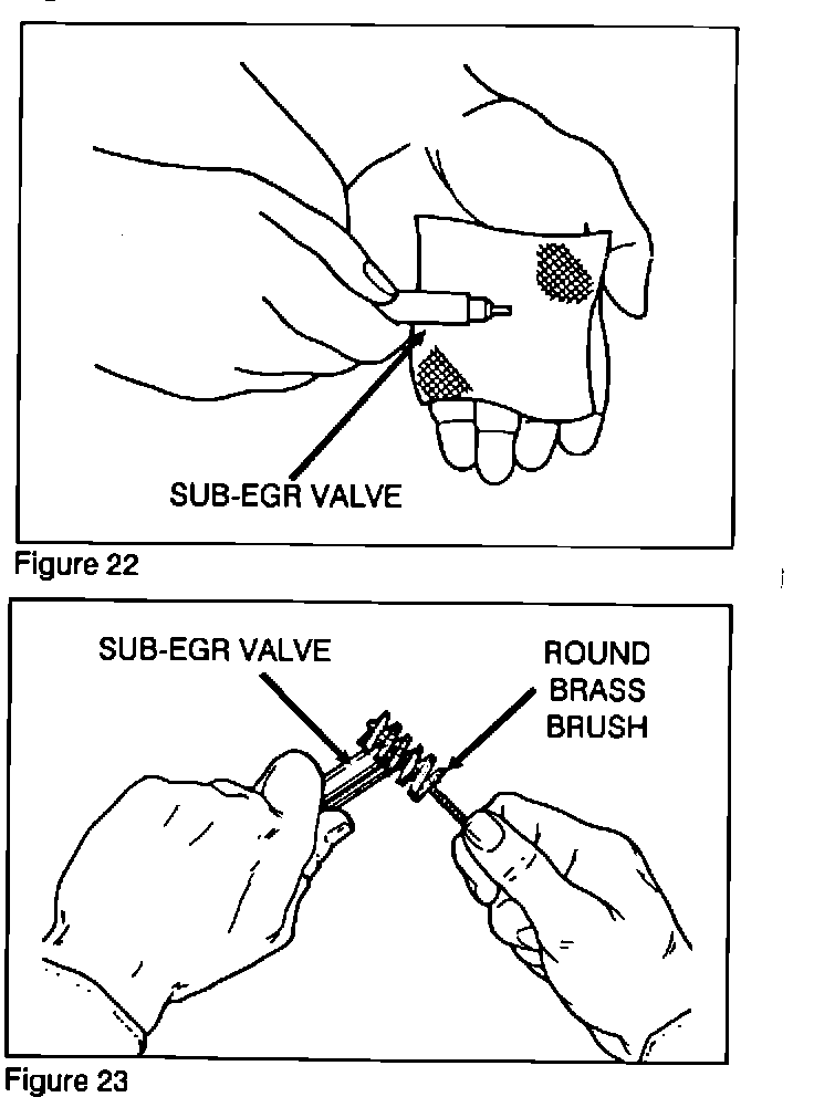 Do not use a screwdriver or a steel bristle wire brush in the bore of the Sub-EGR valve since this will scratch and cause carbon to build up on the valve quickly.