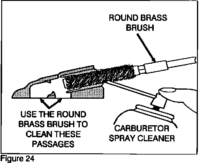 4. Clean the plunger hole in the carburetor with carburetor cleaner. Insert a round brass brush into the Sub-EGR valve bore and clean the plunger hole (Figure 24). Use the round brass brush to clean the underside valve passages.