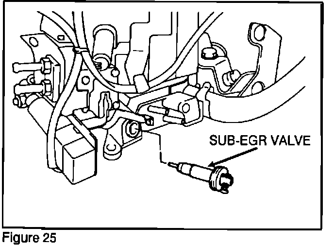 5. Dry the valve and plunger hole thoroughly. If removed, install the spring, steel ball, pin and snap ring. Re-install the Sub-EGR valve in the carburetor (Figure 25). Connect the valve linkage to the pin.