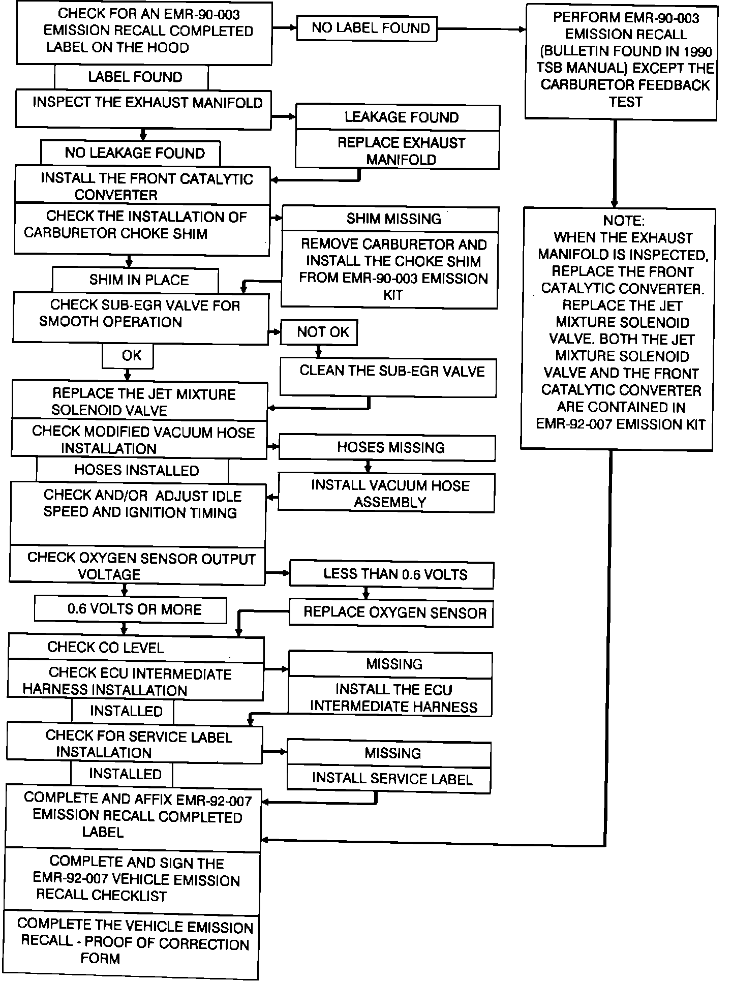 1. Check for the installation of the previous emission recall completed label (EMR-90-003). If the label is found on the hood, proceed to step 2 below. If the EMR-90-003 Emission Recall Completed Label is NOT found, do EMR-90-003 except the carburetor feedback system testing. While performing EMR-90-003, install the front catalytic converter which is contained in EMR-92-007 emission kit and also replace the Jet Mixture Solenoid valve with the new green valve. Check CO level at 2,500 RPM. If the CO reading is greater than 1.2% at 2,500 RPM, visually check the new Jet Mixture Solenoid Valve installation for misalignment. If the Jet Mixture Solenoid Valve is correctly installed, replace it with another new green Jet Mixture Solenoid Valve. If the CO is still greater than 1.2%, refer to the 1986 Truck Service Manual for troubleshooting procedures which begin in section 14. The EMR-90-003 Emission Recall Bulletin can be found in the 1990 Technical Service Bulletin Manual beginning on Page 381. After completing EMR-90-003, proceed to step 13.