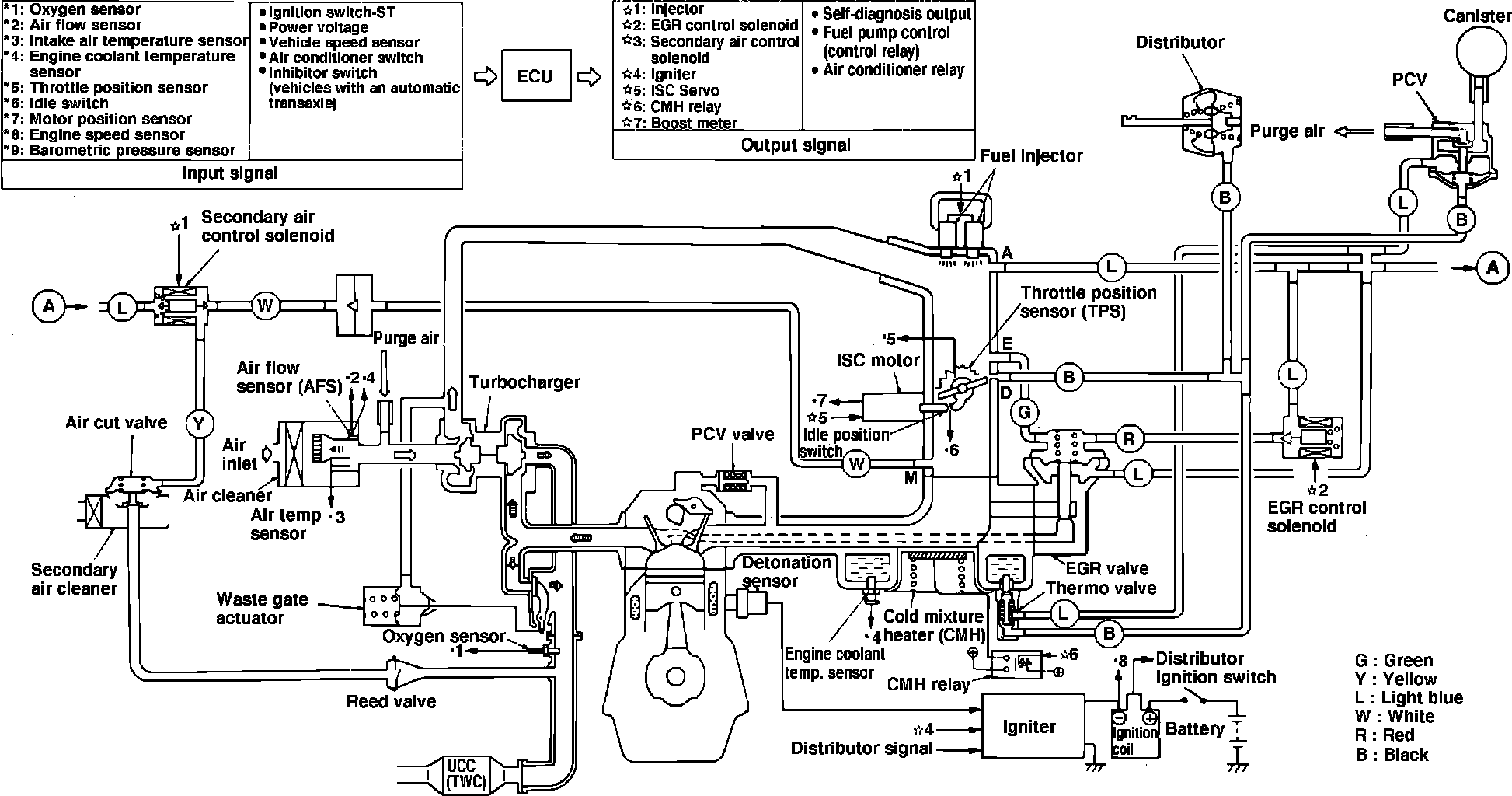 The Electronically Controlled Injection System (ECI), Figs. 6 through 9, used on the 1987 - 88 turbocharged engines, is a computer controlled, dual point fuel injection system which provides a precise fuel/air ratio under all driving conditions. The system utilizes a pre-programmed electronic control unit (ECU), to regulate ignition timing, idle speed, emission devices and fuel/air ratio. Various sensors and switches located throughout the engine compartment provide information to the ECU. This system also incorporates a self diagnosis function which monitors various parameters for proper operation.