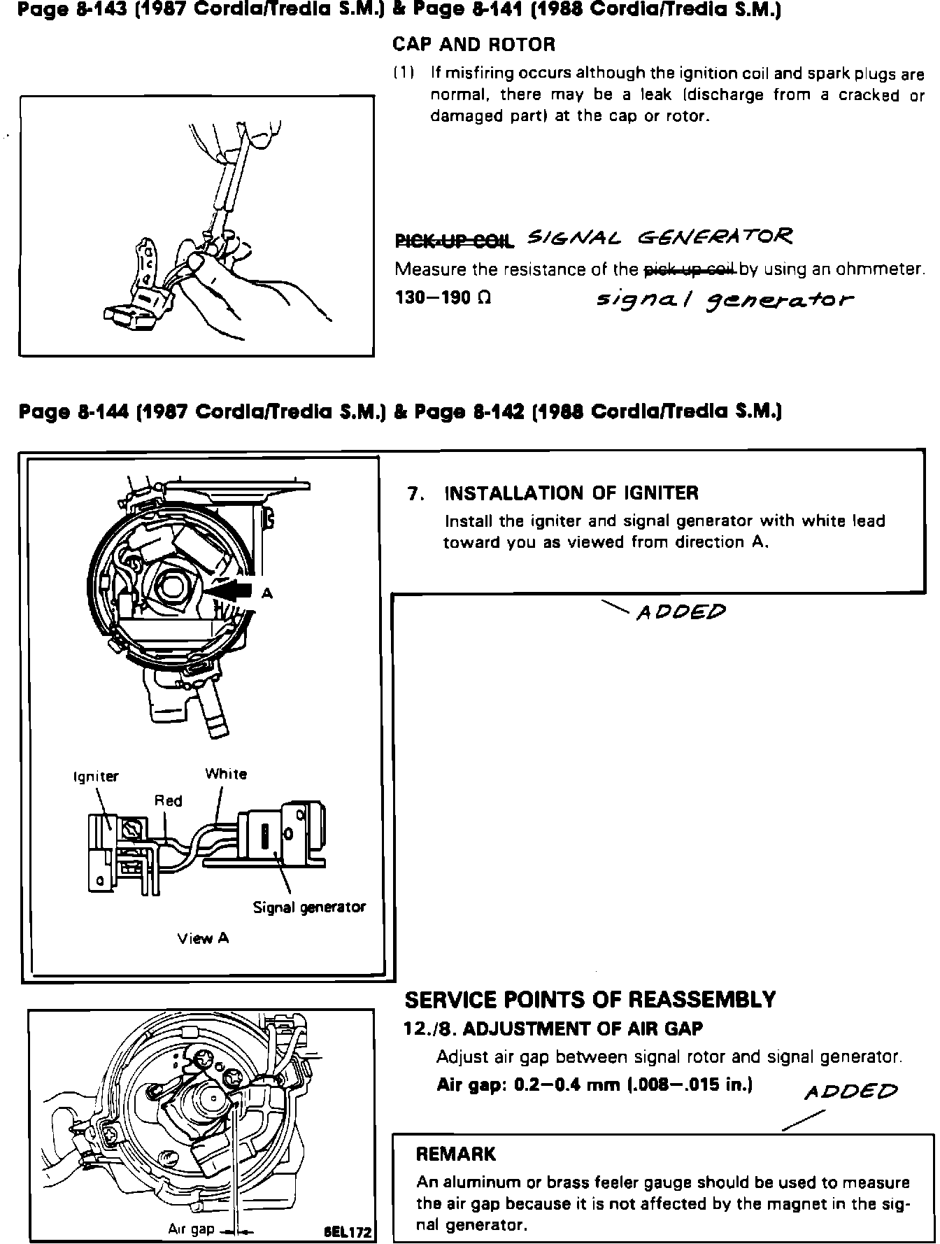 This bulletin contains revised distributor assembly and adjustment procedures for 1987-1988 Truck and 1986-1988 Cordia/Tredia vehicles.