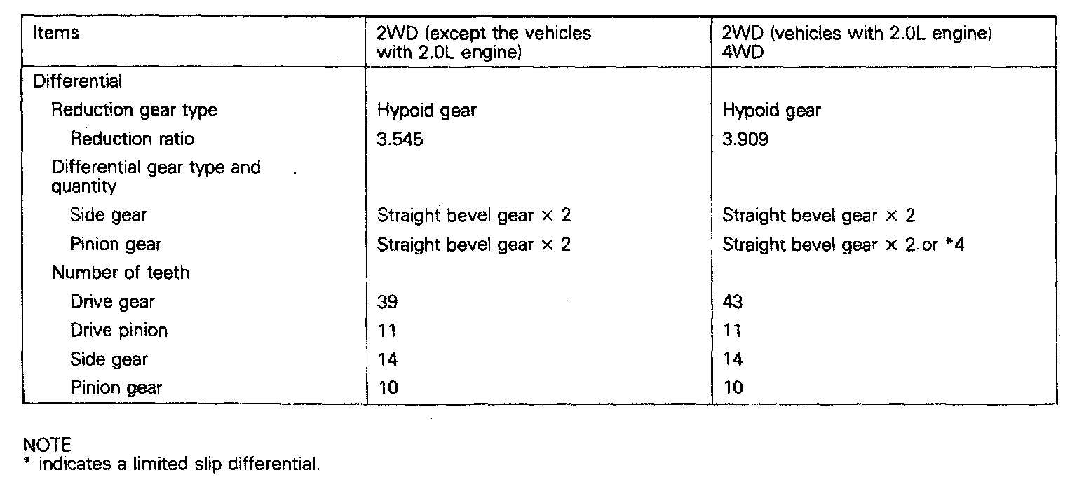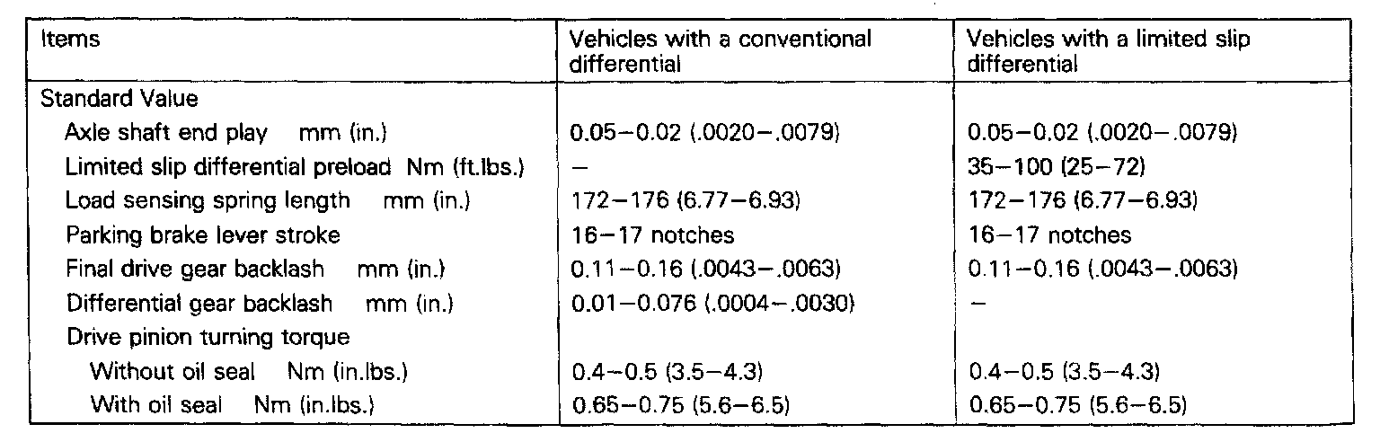 2WD/4WD Rear Axle Differential Standard Values: