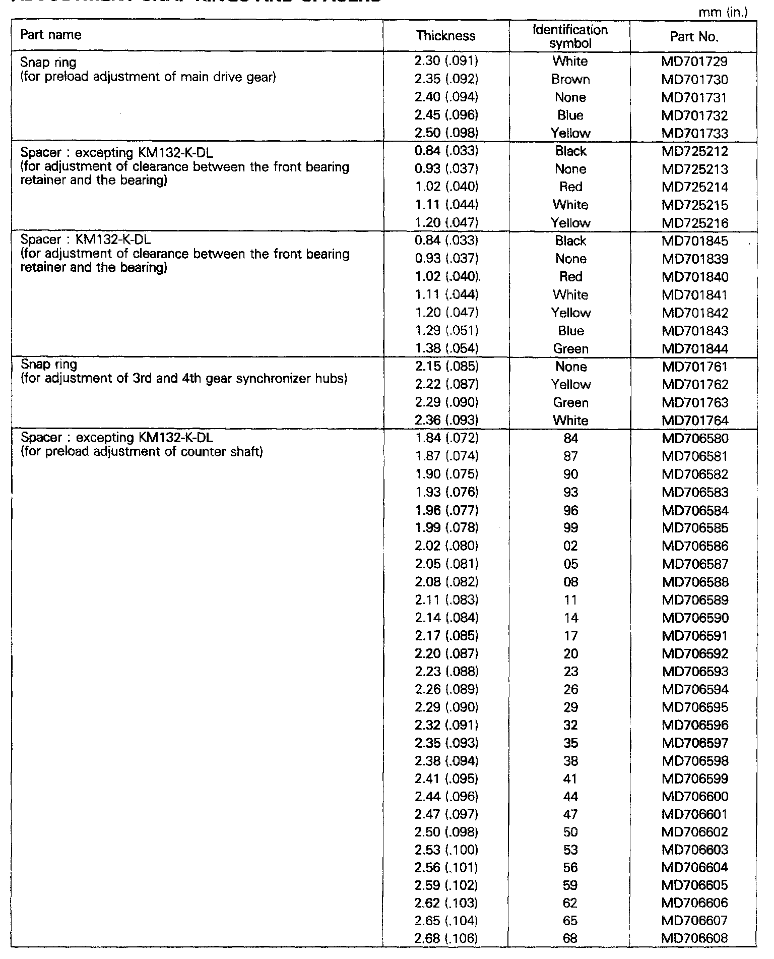 KM132/KM145 5-spd M/T, Snap Rings & Spacer Thickness: