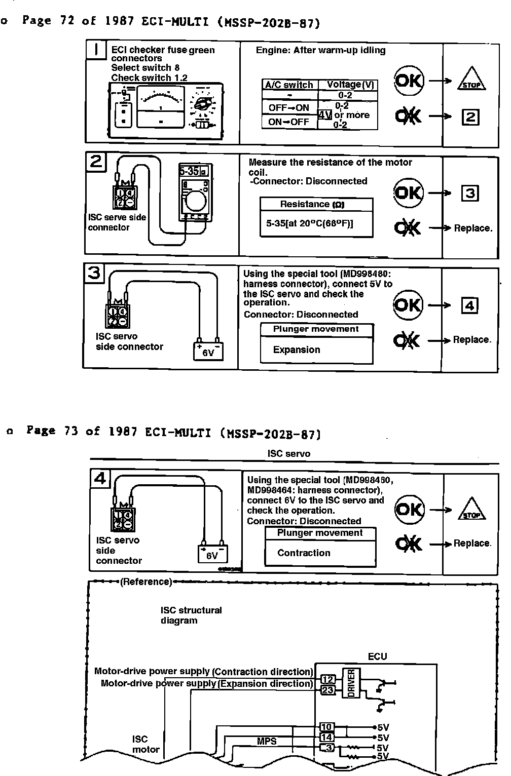 Pages 72 and 73 In the (1) box, change 6V to 4V. In the (2) box, change the resistance value to 5-35 @ 20~C (68~F). In the (3) box, change "Contraction" to "Expansion". In the (4) box, change "Expansion" to "Contraction". In the Reference illustration, change "Expansion Direction" to "Contraction Direction" and "Contraction Direction" to "Expansion Direction". These changes are illustrated below.