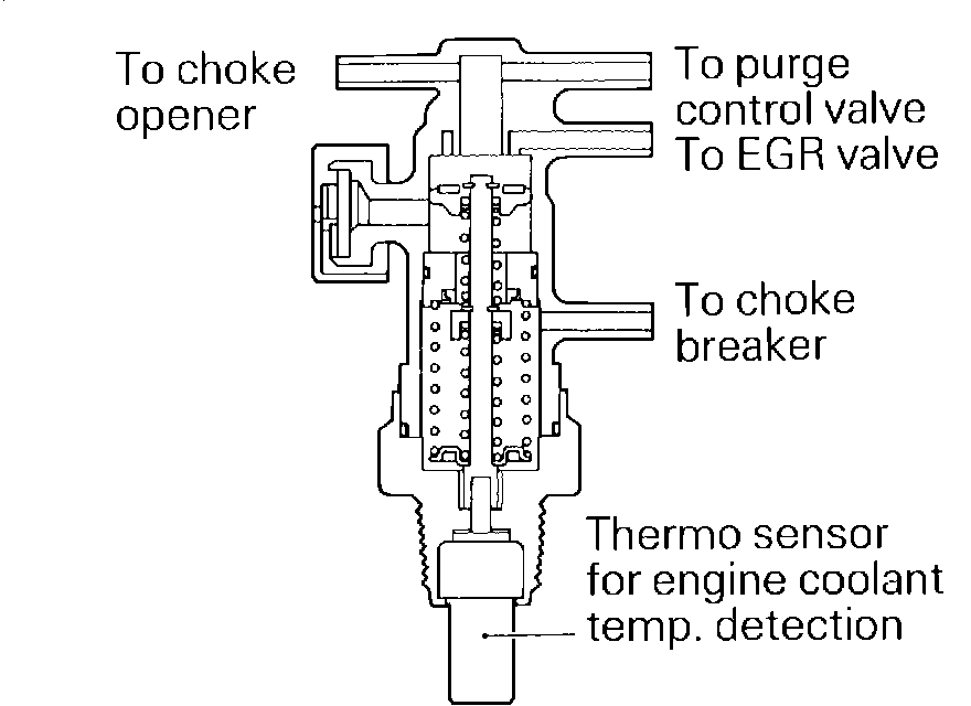A thermo valve, Fig. 94 is used to sense the coolant temperature at the intake manifold. The thermo valve controls the purge control valve, choke breaker, EGR valve, and choke opener.