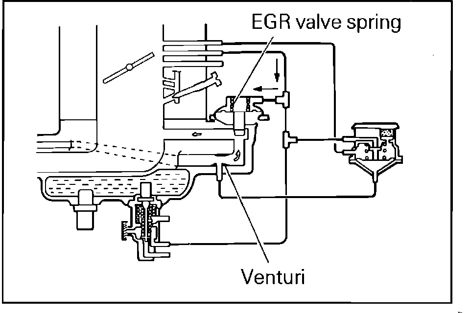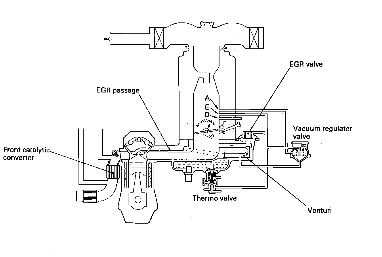 At operating temperature when the throttle is low to mid-range the thermo valve closes allowing 'E' port vacuum, Fig. 62 to open the EGR valve. As the EGR valve opens venturi pressure in the EGR port falls due to the increased flow of exhaust gas.