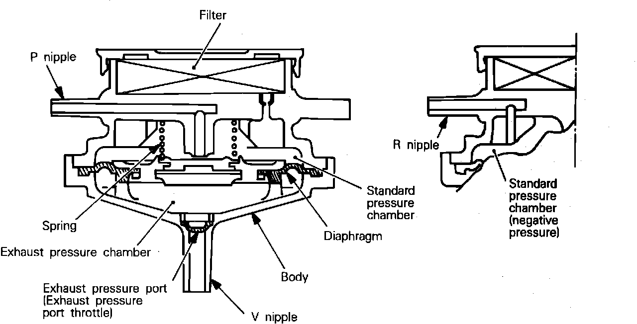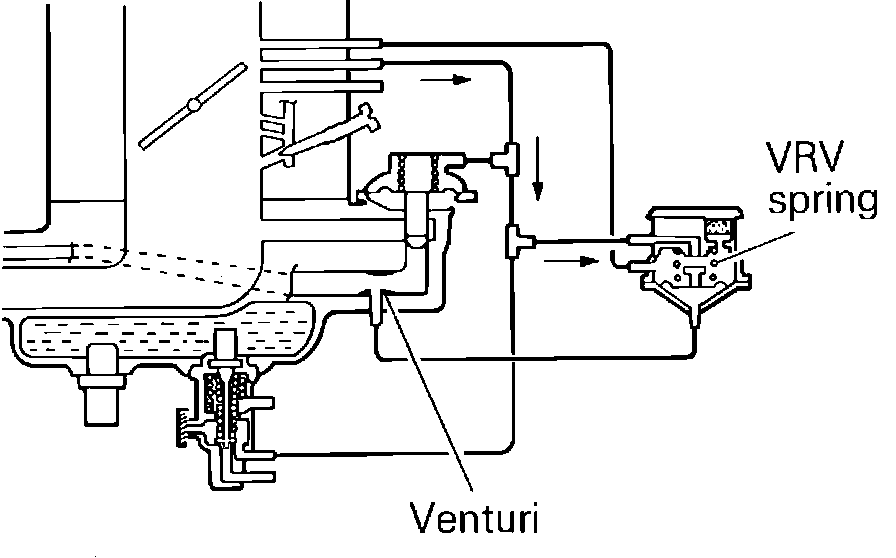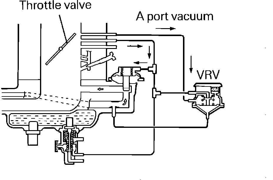 As the pressure in the EGR port venturi falls the vacuum regulator valve (VRV) opens to vent 'E' port pressure to atmosphere, Fig. 63. The EGR valve then closes slightly reducing the flow of exhaust gases.