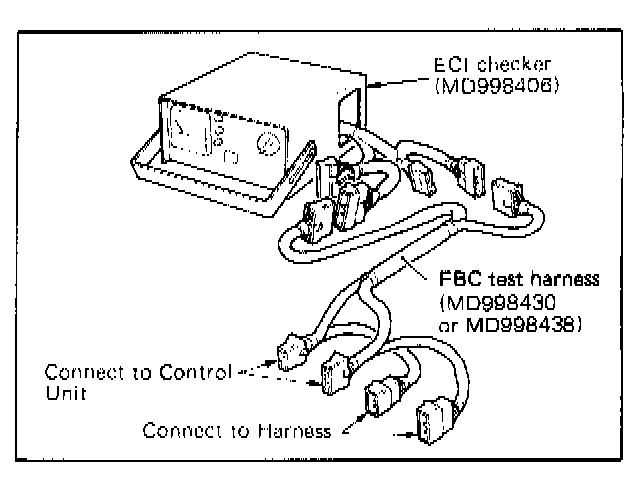 5. Connect the FBC TEST HARNESS to the connectors of the ECI checker, and then connect the FBC TEST HARNESS to the ECU and the harness connectors.