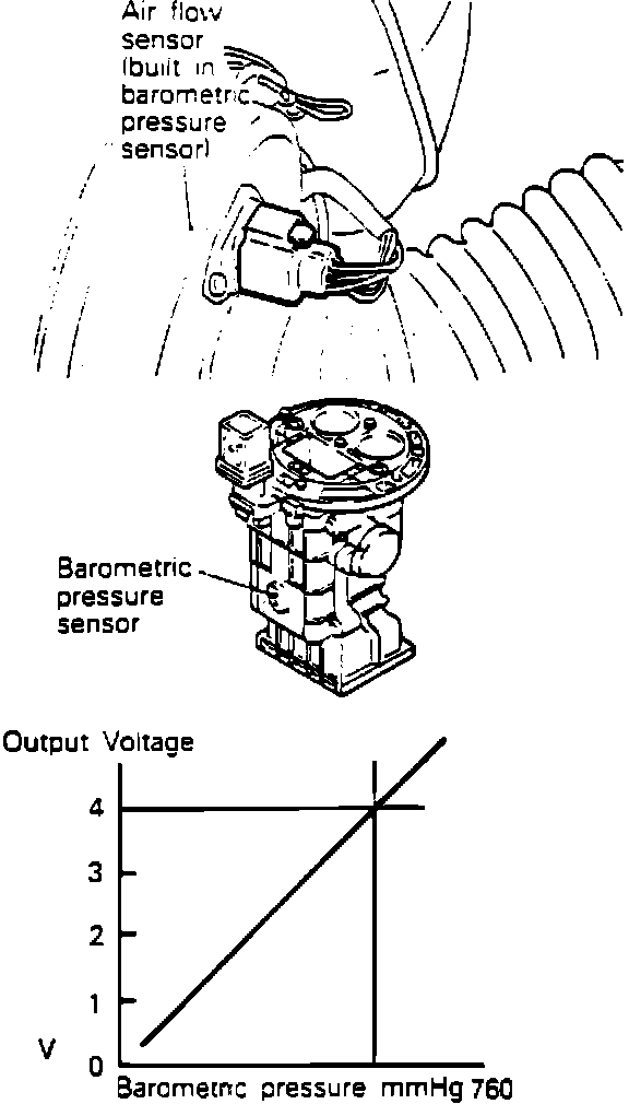 The Barometric Pressure Sensor installed on the Air Flow Sensor (AFS) senses the atmospheric pressure and converts it into a voltage which is sent to the ECU. The ECU uses this signal to compute the altitude at which the vehicle is running, accordingly correcting the air-fuel ratio and the ignition timing, thus improving driveability at high altitude.