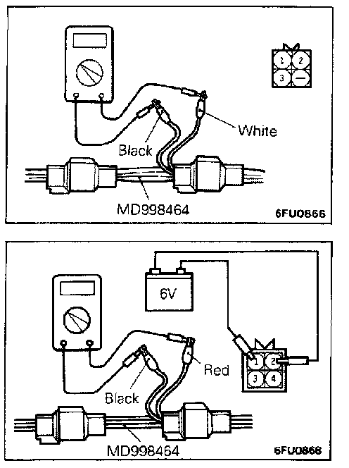 (4) Connect a 6V DC power supply between terminals 1 and 2 of the idle speed control motor connector to activate (extend and retract) the idle speed control motor. Measure the resistance between terminal 1 (black clip of special tool) and terminal 2 (red clip) of the idle speed control motor position sensor connector.