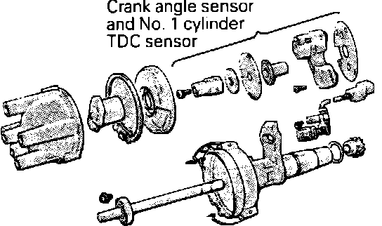 The Crank Angle Sensor and the Top Dead Center Sensor are located within the distributor housing. These sensors are incorporated into one unit, being a disc and a pick-up unit. The disc is affixed to the distributor shaft and the light-transmitting unit is mounted stationary to the distributor housing.