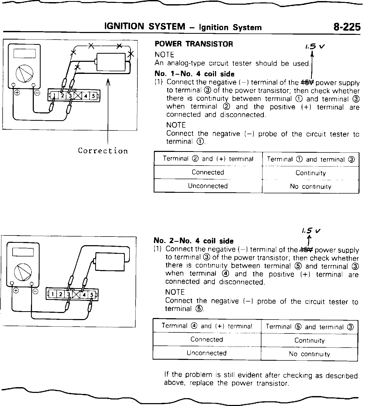 This bulletin is to inform you of a revision to the 1989 Galant Service Manual. In order to check the ignition power transistor, voltage needs to be applied to certain terminals. The service manual states that voltage should be 15 volts, which is incorrect and should be changed to 1.5 volts. Also, the polarity of a test meter is reversed in one procedure, and battery polarity is reversed in another, and need to be changed. As a reference to this bulletin, "TSB-89-08-003" in the TSB Revision box at the bottom of pages 8-221 and 8-225 in Volume 2 of the 1989 Galant Service Manual.
