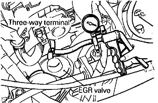 1. Disconnect the vacuum hose (green stripe) from the EGR valve and connect a vacuum pump with a "T" fitting.