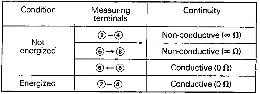 Note: In the following tables, the arrows indicate direction of current flow. Confirm circuit tester polarity before checking continuity.