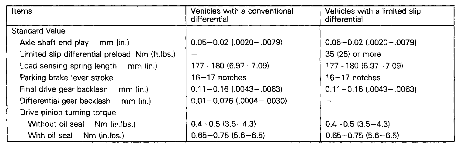 KM132/AW372, 2WD Rear Differential Standard Values: