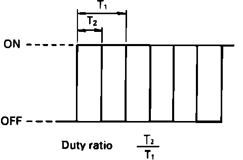 The ECU controls the air-fuel ratio by controlling the duty cycle of the valve. The frequency of ON-OFF cycles remain constant at 10 Hz pulses, but the solenoid "ON" time portion of each cycle is changed to modify the duty ratio. The higher the duty ratio (the longer the ON time), the leaner the air-fuel ratio.