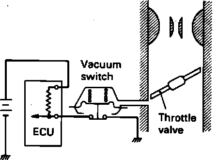 The Vacuum Switch is a contact type switch that is operated by intake manifold vacuum. When the throttle valve closes, the intake manifold vacuum acts on the vacuum switch to close its contact. By this action, the voltage on the ECU side is grounded and the ECU senses that the throttle valve opening is near idle.