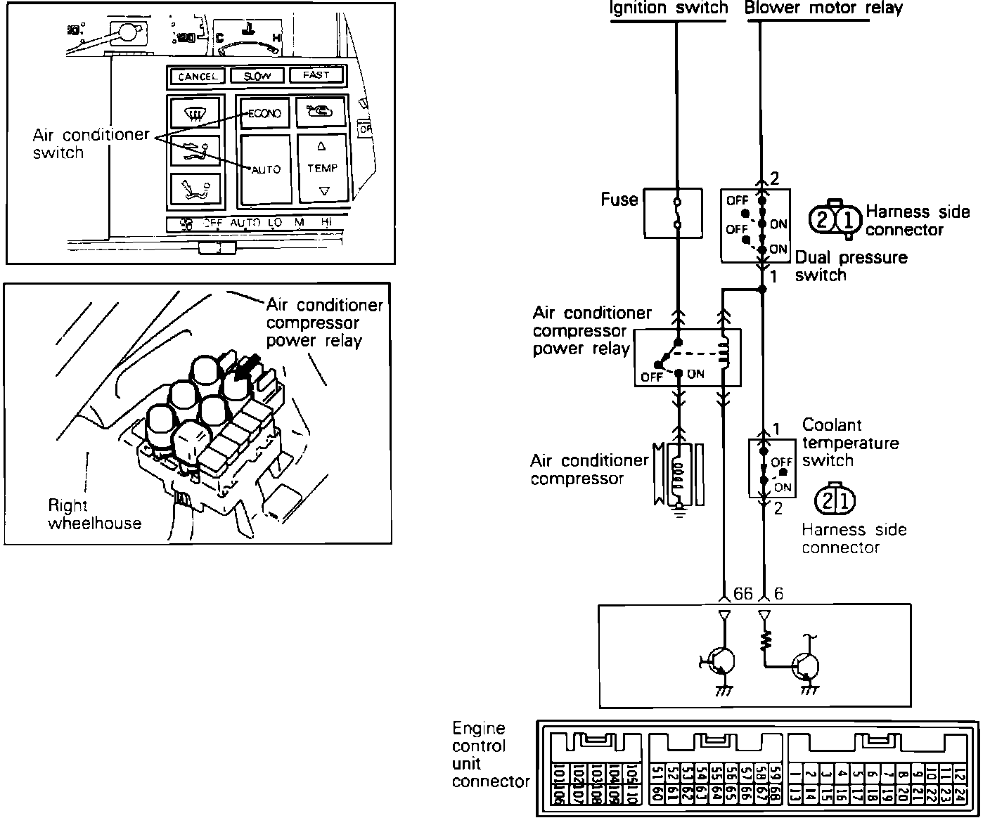 To test the Air Conditioning Signal to the ECU, disconnect the ECU connector and locate pins 7 and 65 on the ECU connector and test for the presence of power with the A/C switch in the "on" position and the ignition on. System voltage should be available with the switch in the "on" position and 0 volts should be present in the "off" position. If there is no power at the ECU, the air conditioning circuits should be checked. Refer to HEATING, VENTILATION AND AIR CONDITIONING.