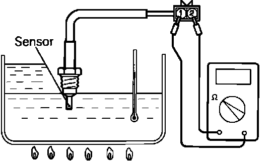 3. Heat the water to 50 degrees C or 122 degrees F. Verify that the resistance of the sensor falls between 60 and 83k ohms.