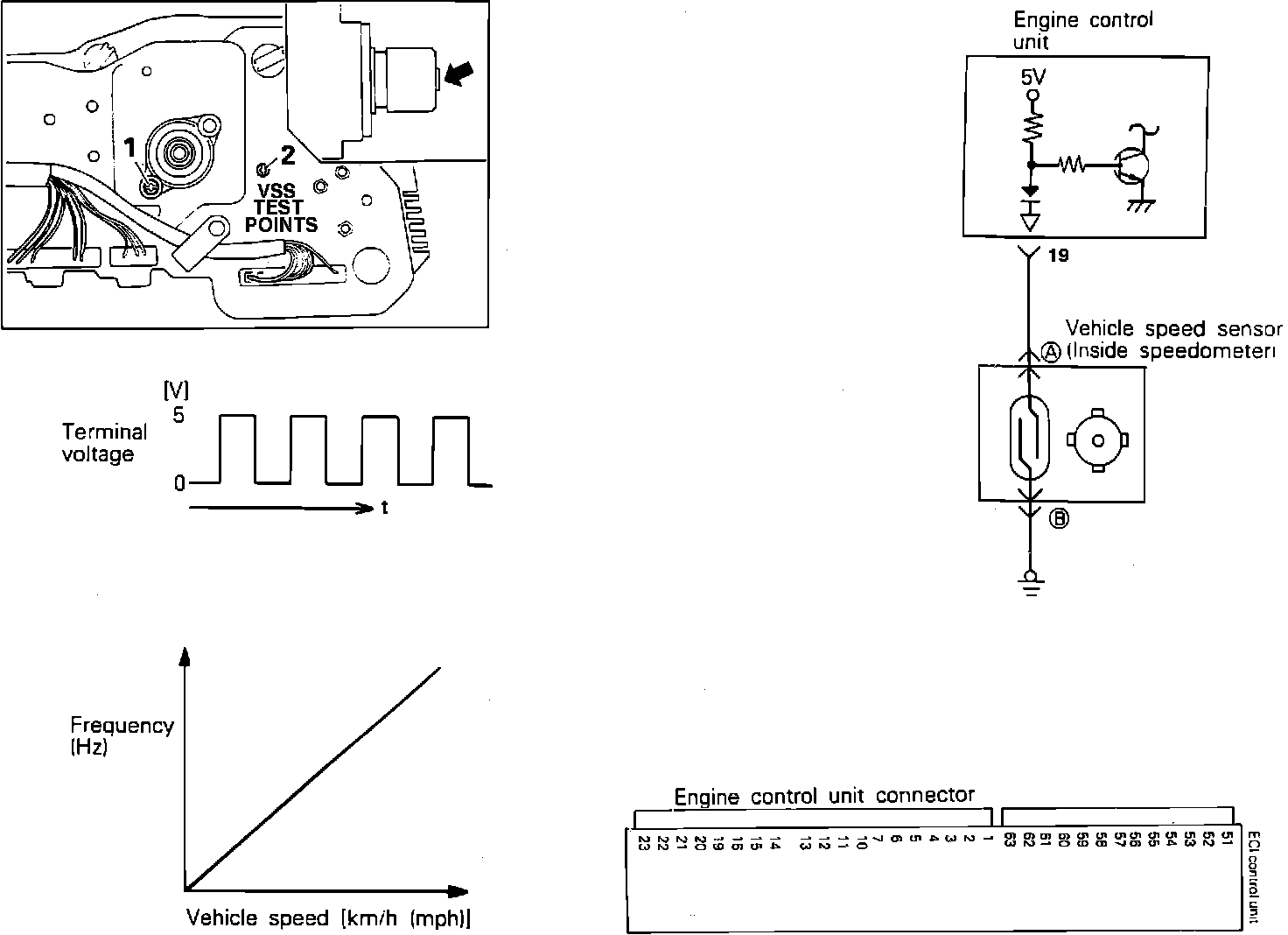 7. To determine if the VSS is grounded or faulty, turn the ignition switch "off" and test for continuity between ECU pin 19 and ground (using the same test method as in step #3). If continuity alternates, the VSS is operating properly (the ECU is bad). If continuity remains constant, either there is a ground between the VSS and the ECU, or the VSS is faulty.