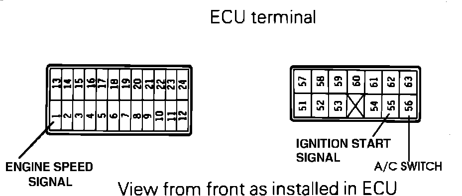 To test the Ignition Signal to the ECU, locate ECU pin 51. Test for the presence of battery voltage with the ignition key in the "on" position. There should be battery voltage present. If no voltage is present, then test for battery voltage at the control relay pins 8, 7, 3 and 5. If no voltage is present, test relay or repair harness.