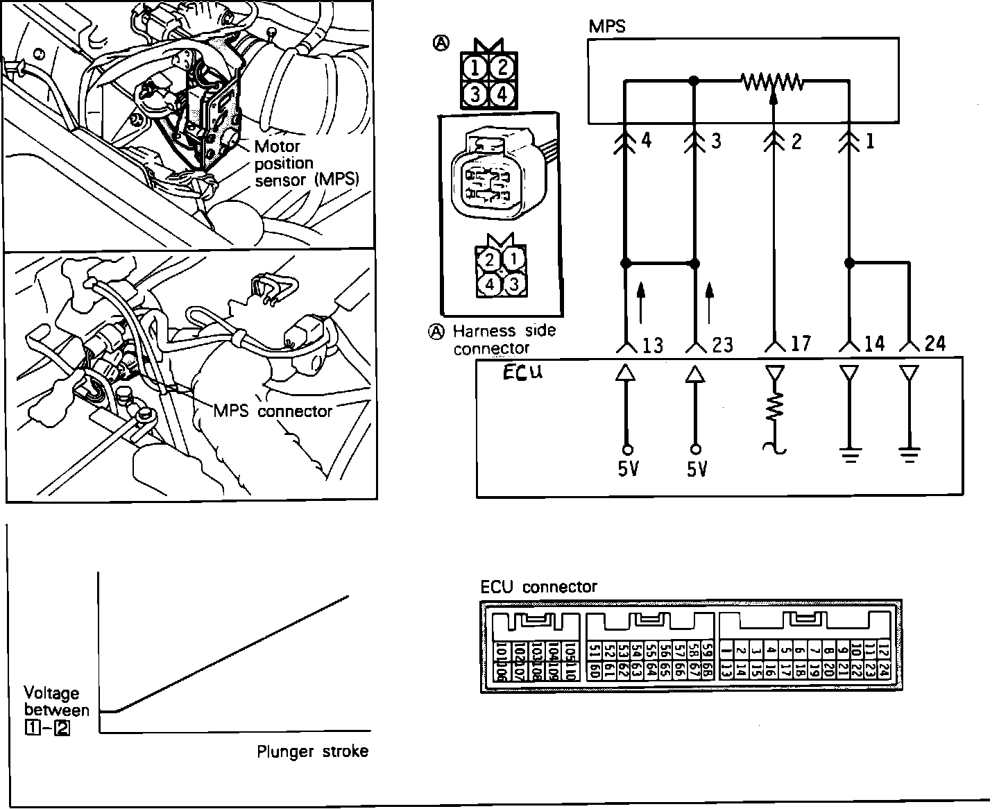 The Motor Position Sensor (MPS), located in the Idle Speed Control (ISC) servo, is a variable resistor type sensor. It uses a plunger (contact), that is connected to the ISC servo and a set of electrical windings, that are stationary. As the servo moves, so does the plunger, changing the output Voltage of the sensor. The ECU uses this signal to determine the position of the ISC servo.