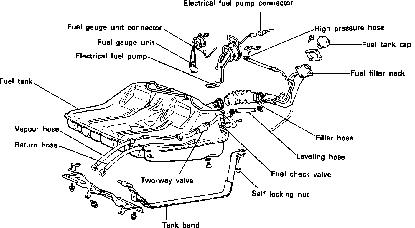 The fuel pump is located inside the fuel tank mounted on the forward wall of the fuel tank directly under the connector.