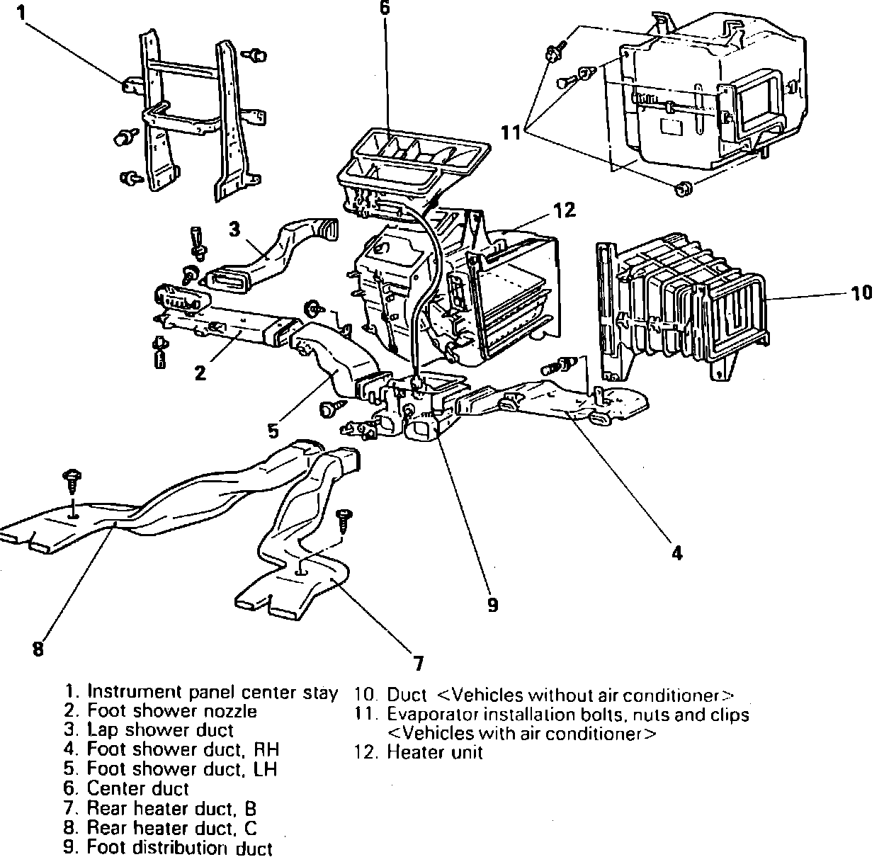 4. On models equipped with A/C, remove bolts and nuts attaching evaporator assembly to heater unit.