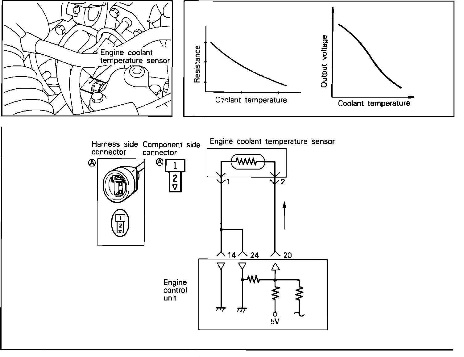 As engine temperature increases, sensor resistance decreases. The ECU monitors engine temperature by the sensor output Voltage and provides optimum fuel enrichment when the engine is cold.