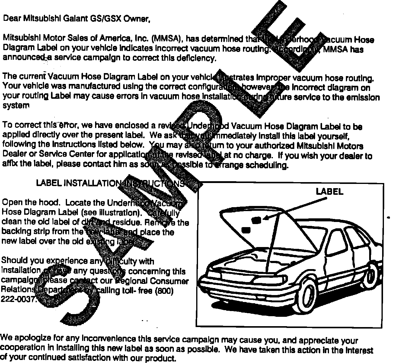 The Service Information (Vacuum Hose Routing) Label is incorrect and must be changed on a limited number of 1990 Galant GS/GSX vehicles sold in California and the 49 States. A letter has been sent to the affected vehicle owners instructing them to install the Service Information Label themselves. A copy of the customer notification letter appears on page